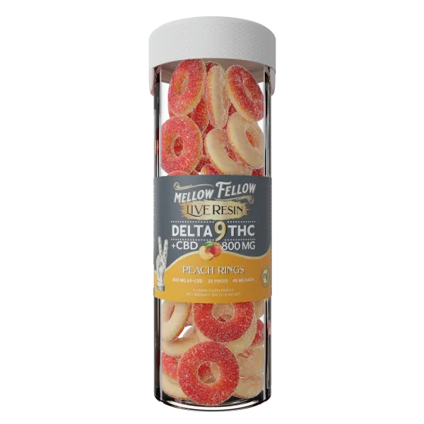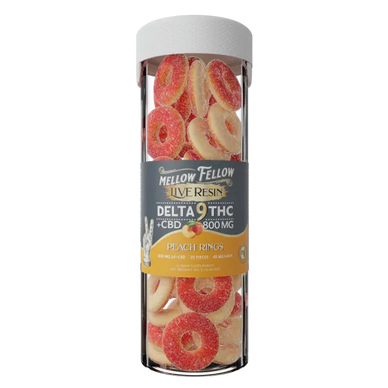 Indulge in a flavorful and potent experience with our Mellow Fellow Delta 9 THC+CBD Peach Rings. Infused with premium Delta 9 and CBD oil, each gummy is expertly crafted for maximum potency and juicy peach flavor. Made by PhD pharmacists, these edibles offer a blissful taste without compromising on strength.